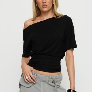 Off-shoulder top with drapey detail Raw neckline. soft ruched detail. fitted waist. cap sleeves Good stretch. partially lined Princess Polly